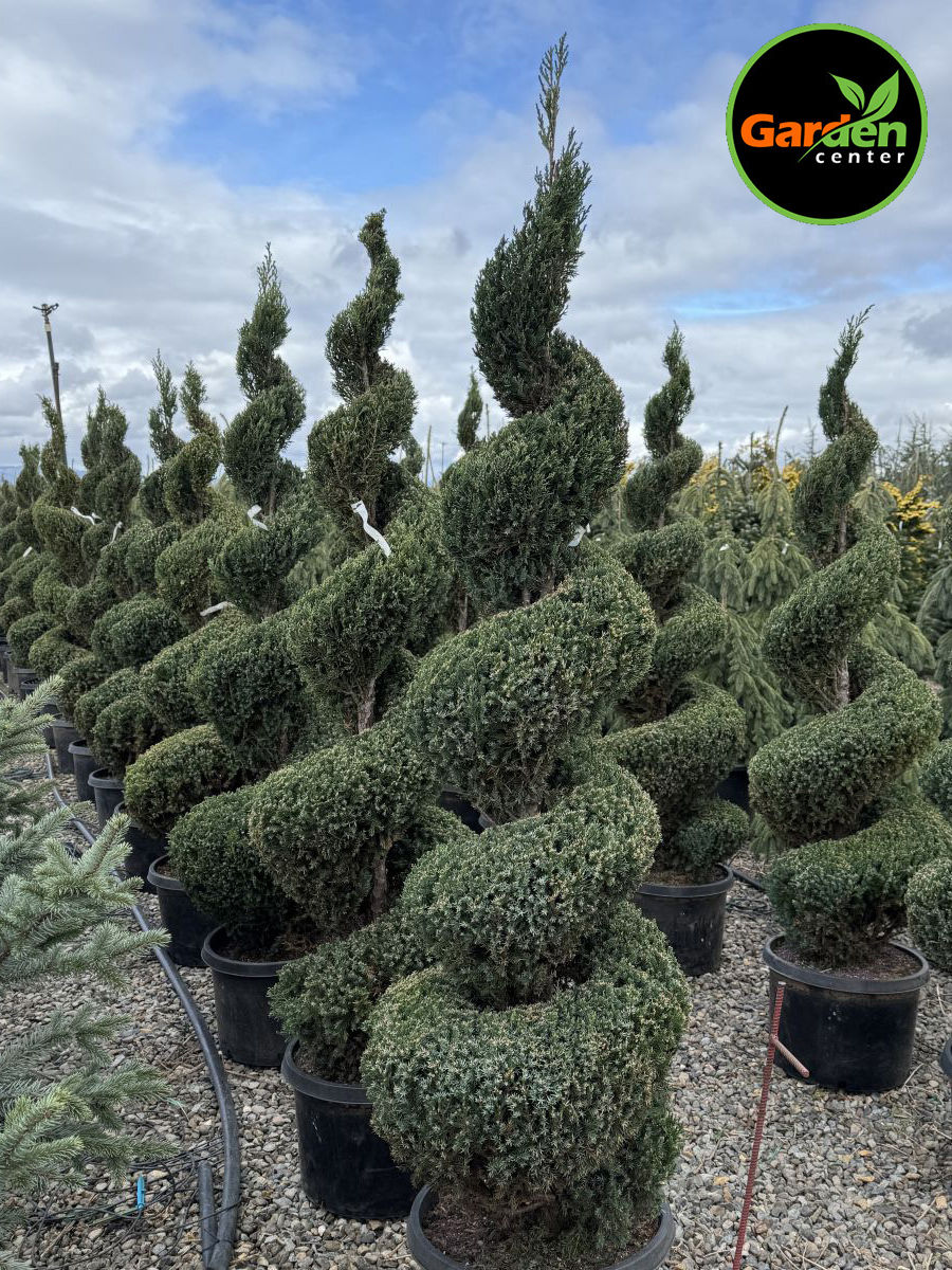 • Dense blue-green foliage with a refined, sculpted spiral shape